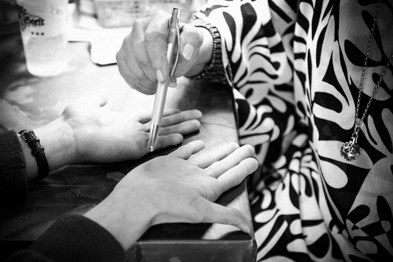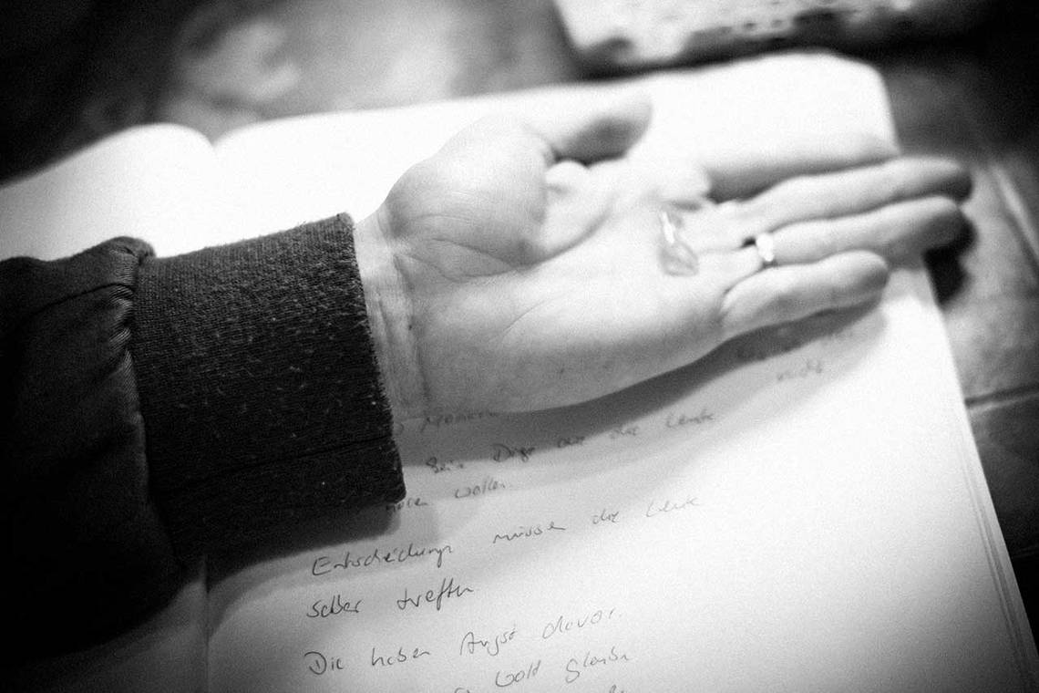 Ronja hat ein flattriges schwarz-weißes Etwas übergeworfen, von dem ich glaube, dass es so etwas wie ihre Arbeitskleidung ist. Ich setze mich ihr gegenüber, auf dem Tischchen zwischen uns steht ein kleines Holzschild – „15 Euro“ steht da. Das ist also der Preis der Macht. Dann nehmen ihre goldberingten Finger meine Hand und es geht los. Irmgard Lauenburger alias Ronja ist eine angenehme Frau, nicht aufdringlich und ruhig. Ich hätte mir das Auftreten einer Wahrsagerin prätentiöser vorgestellt. Die Menschen, die Ronja besuchen, hegen keine Zweifel daran, dass sie das kann, was sie vorgibt zu können: in die Zukunft sehen. So stützt die abgeklärt-bestimmte Art dieser Frau ihre Glaubwürdigkeit. Mit fast schon gelangweilter Routine liest sie in meiner Hand als ob sie mir aus der Zeitung vorläse. Es steht ja alles da. Ihr rechter Mundwinkel ist ein wenig schief, vielleicht die Folge einer Erkrankung. Das lässt ihre Worte verwaschen klingen, gibt ihrem Erscheinungsbild aber auch etwas Geheimnisvolles. Schnell schwirrt mir der Kopf, weil ich versuche, zwischen investigativem Interesse und privater Neugierde einzuordnen, was mir Ronja da gerade alles über mein Leben erzählt – wie es sein wird: Die Änderungen kommen in Dreier-, Sechser und Neuner-Zyklen, Kinder, berufliche Orientierung, Eigentum und natürlich – die Liebe. Im Großen und Ganzen wird alles gut. Das ist doch schon mal was. Wie sich später herausstellen wird, ist das die Geschichte, die ich gehört habe – mein Begleiter wird mir eine andere Version präsentieren.