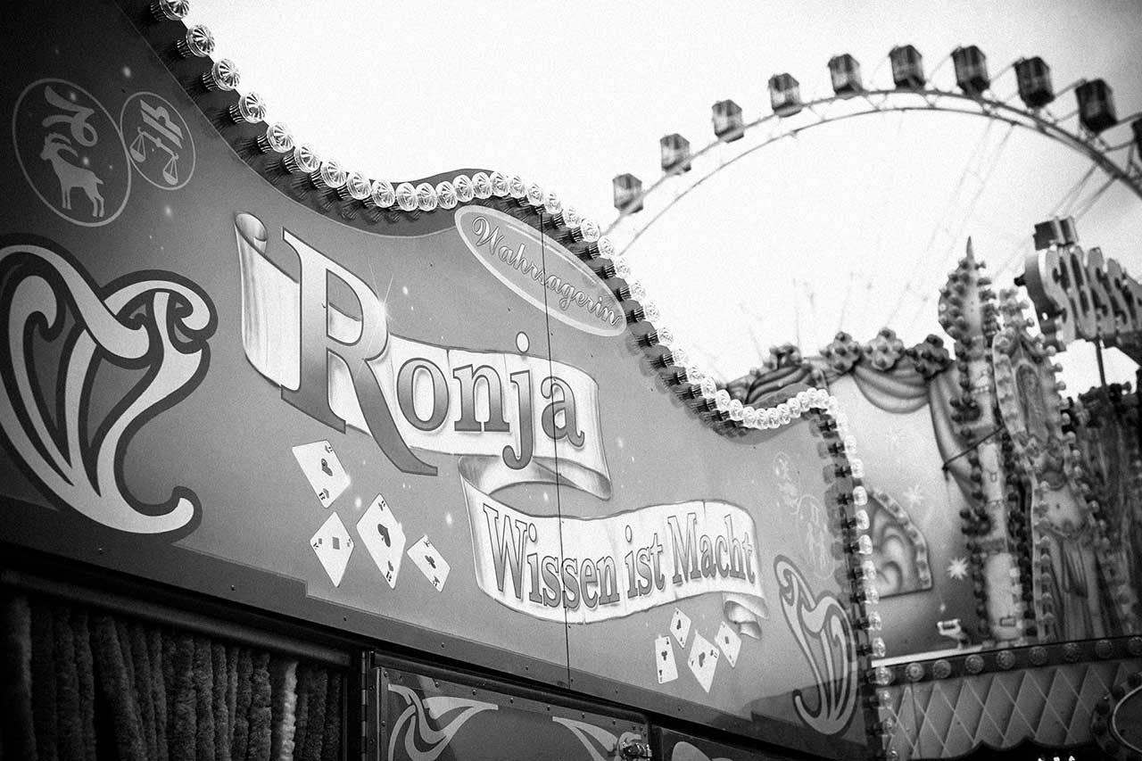 „Ich glaube da ja [eigentlich] überhaupt nicht dran“, ist mein Mantra als ich durch die noch leeren Kirmesgassen laufe. Zucker und Plastik soweit das Auge reicht. Konkurrenz von Bratwurst und Zuckerwatte, Helene Fischer gegen David Guetta: Die Cranger Kirmes ist eine Institution im Ruhrgebiet, mit 500 Schaustellern ist sie das größte Volksfest in NRW. Und irgendwie hat die Jahrmarktromantik heute etwas bedeutungsschweres. Ich bin tatsächlich ein bisschen aufgeregt. Das legt sich jedoch als ich vor Ronjas Container stehe – anders kann man die kleine blaue Box nicht nennen, in der sie täglich aus Händen, Karten und Augen liest. „Wissen ist Macht“ steht da über der Tür und während ich mich noch frage, wer von uns beiden die Macht hat – sie, weil sie in die Zukunft blicken kann oder ich, weil ich gleich wissen werde, was meine Zukunft bringt – kommt sie.