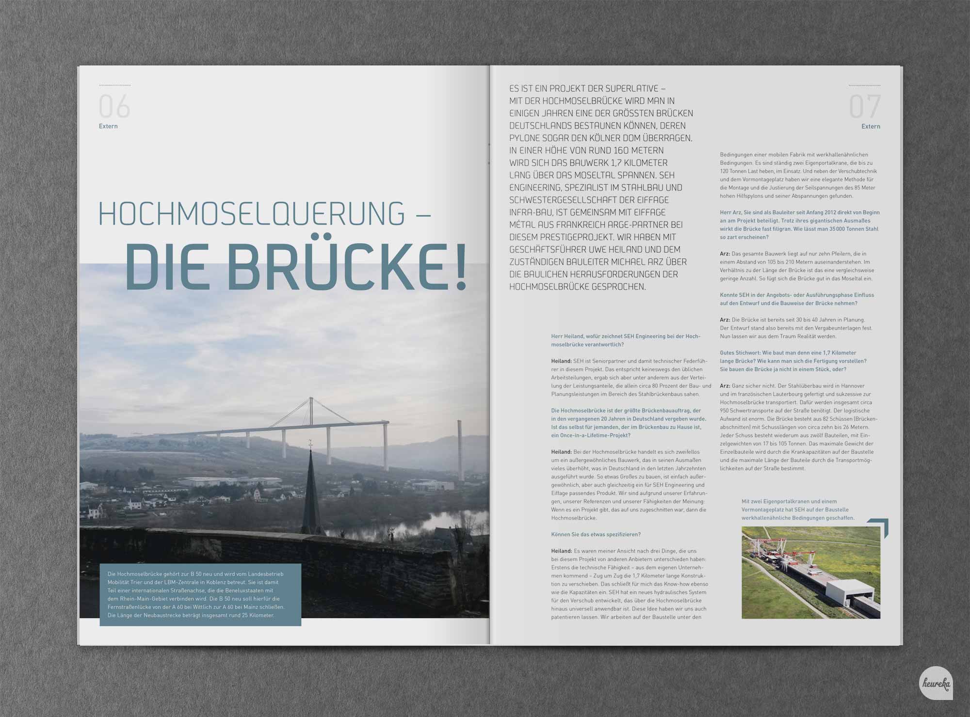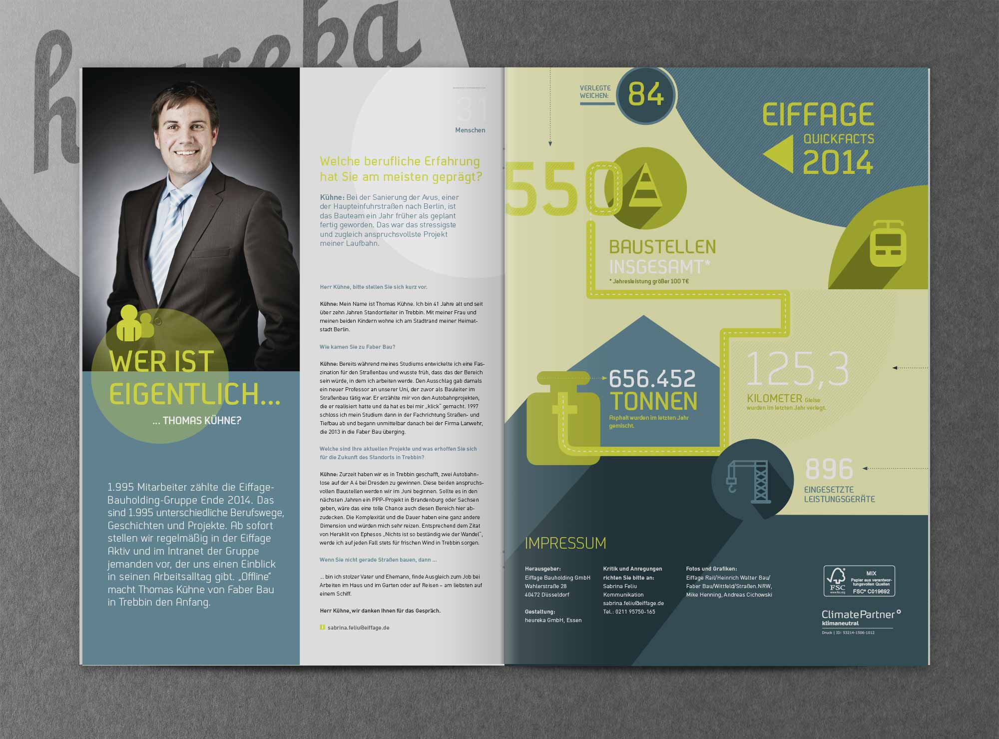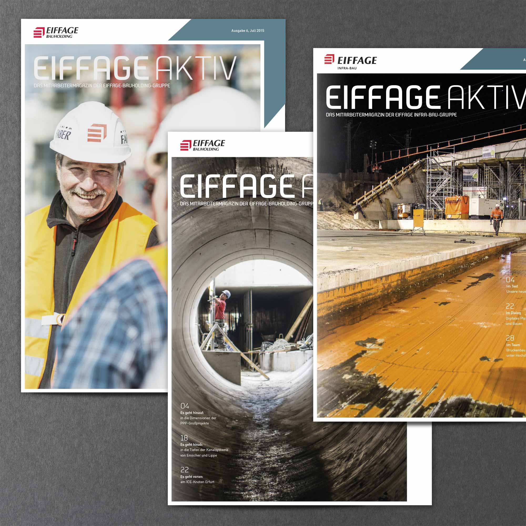 Seit Ausgabe #1 im Jahr 2013 betreuen wir das Mitarbeitermagazin „Eiffage Aktiv“ der Eiffage-Gruppe in Deutschland. Das Magazin beleuchtet mit spannenden Bildern, Illustrationen und informativen Geschichten die vielschichtigen Projekte aus den Tochtergesellschaften der Bau-Gruppe. Die besondere Herausforderung: Die Inhalte für die heterogene Zielgruppe attraktiv und mitarbeiternah gestalten. Mit der Einführung des Magazins wurde gleichzeitig eine Grundgestaltung für den Außenauftritt des Unternehmens geschaffen. Auf dieser Basis entwickeln wir das Corporate Design von Eiffage in Deutschland kontinuierlich weiter.