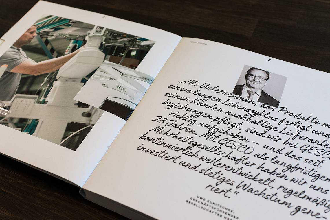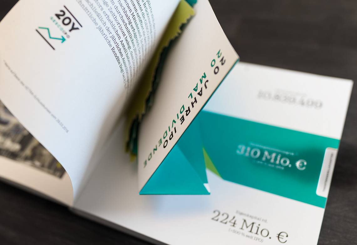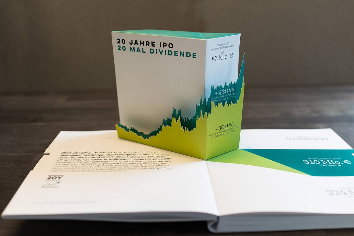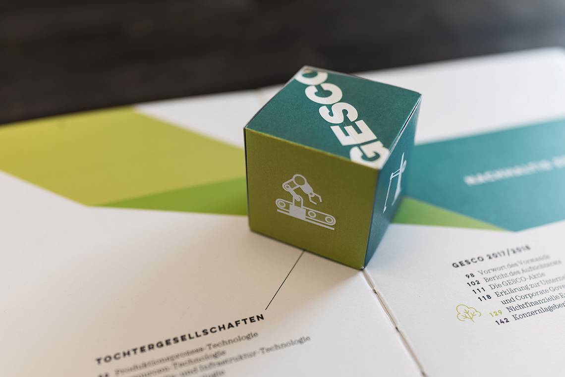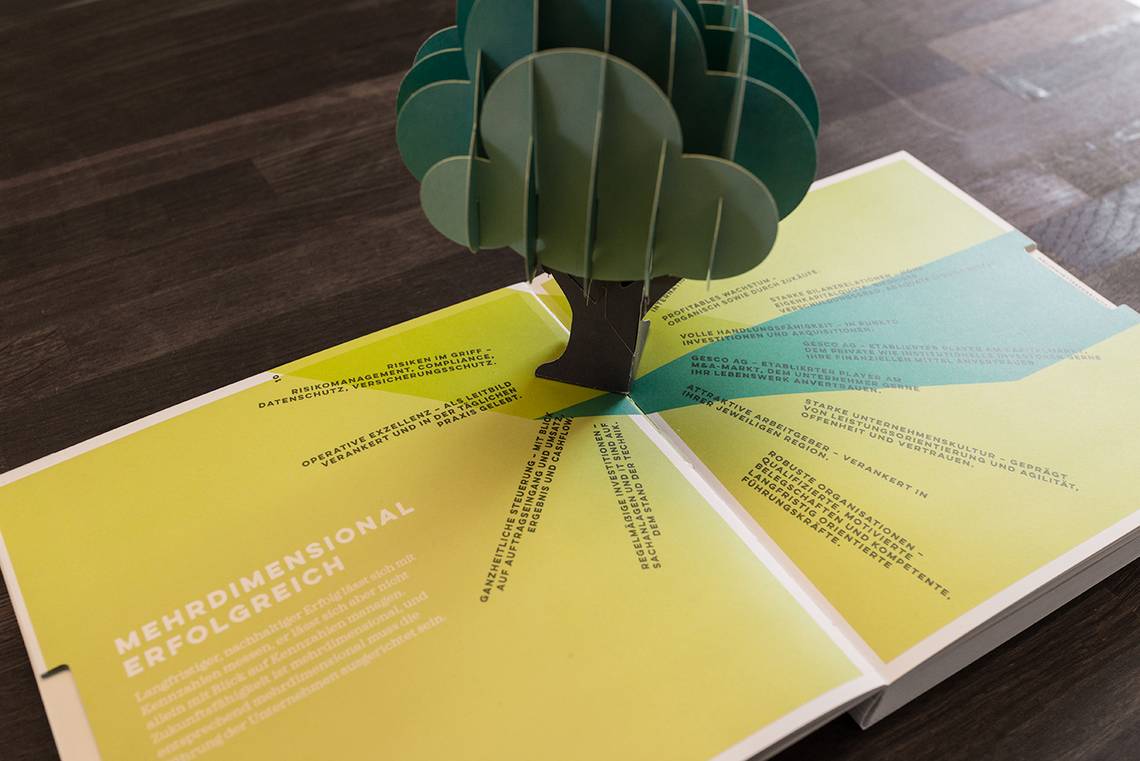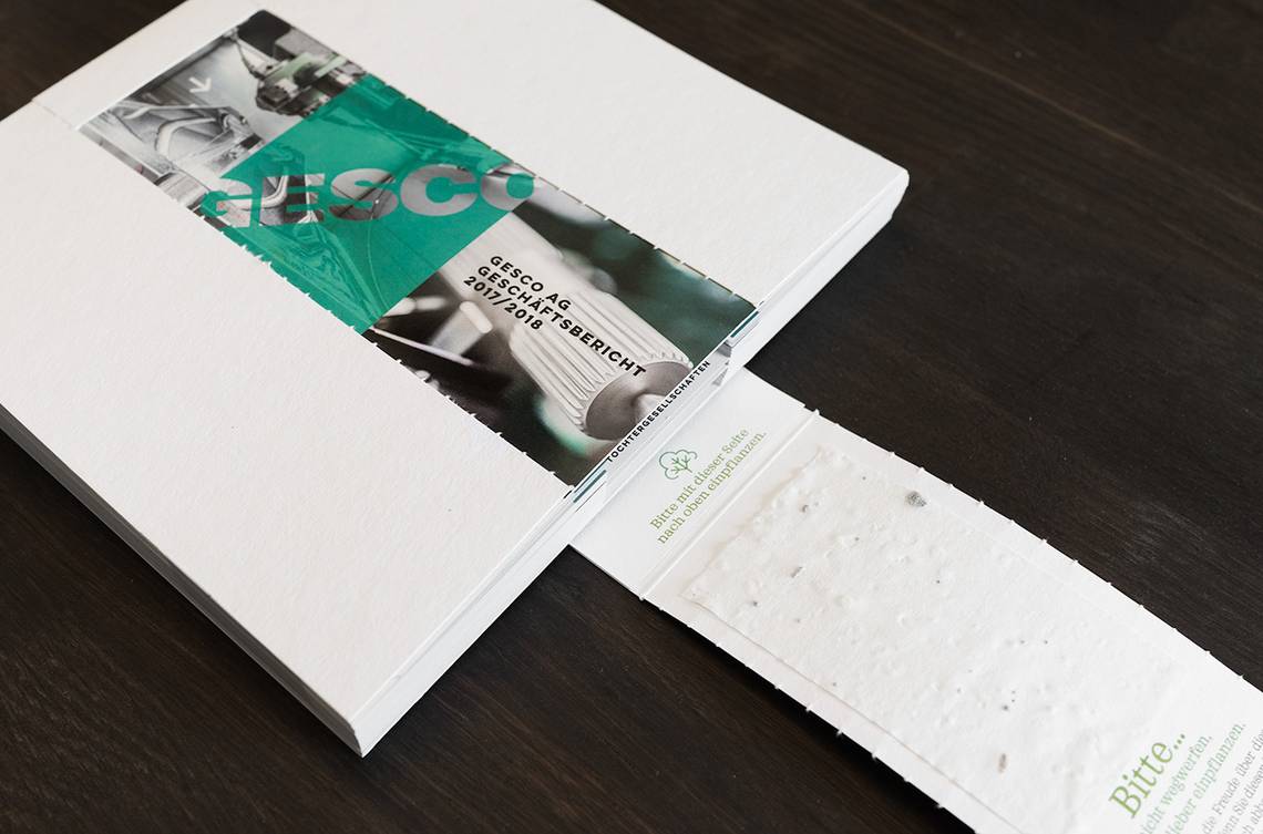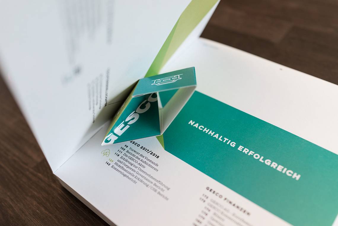 Unter dem Titel „nachhaltig erfolgreich“ beschreibt der Bericht die verschiedenen Aspekte der Nachhaltigkeit als festen Bestandteil der GESCO-Strategie. Erstmalig veröffentlicht GESCO im diesjährigen Bericht auch einen CSR-Teil. Der Geschäftsbericht knüpft in Sachen Design und Verarbeitung an die Vorjahre an: Für den Imageteil des Berichts wurden eigens drei Popup-Elemente konzipiert, welche die inhaltliche Aussage des jeweiligen Kapitels stützen und dabei gleichzeitig spannende Akzente setzen. So eröffnet sich dem Leser beim Aufschlagen der Seite zum 20-jährigen Aktienjubiläum des Unternehmens ein dreidimensionales Aktienchart, das die Mehrdimensionalität des Erfolgs unterstreicht. Nachhaltig ist auch das Cover des Berichts: Ein umlaufender Papierstreifen wird beim erstmalig Öffnen an einer Perforierung abgetrennt und der Titel des Berichts wird sichtbar. Der Papierstreifen bekommt dann eine neue, besondere Funktion: Ein aufgebrachtes Spezialmaterial mit Pflanzensamen macht den Streifen nachhaltig nutzbar, denn eingepflanzt erblühen Wiesenblumen aus ihm.