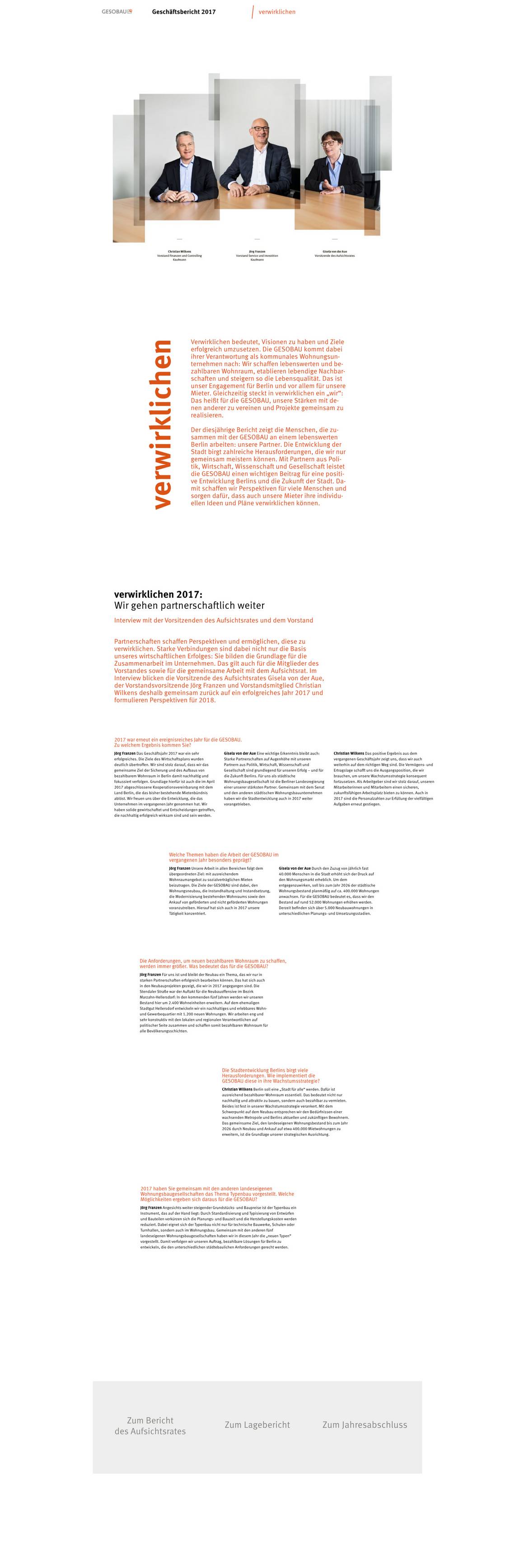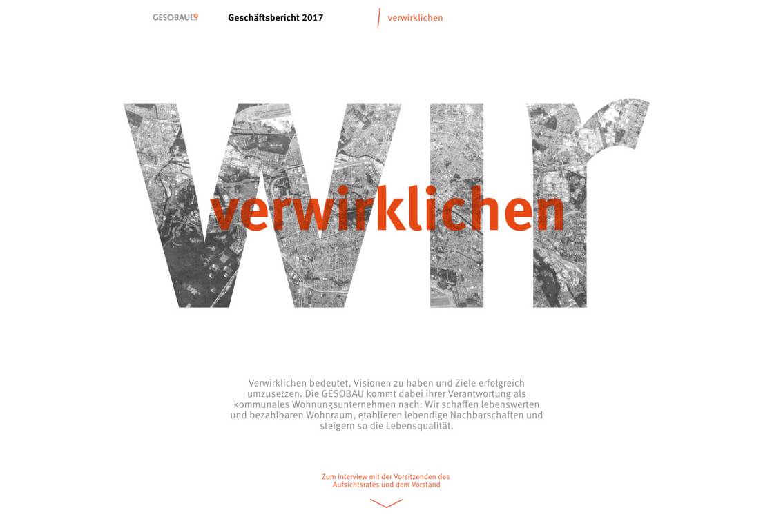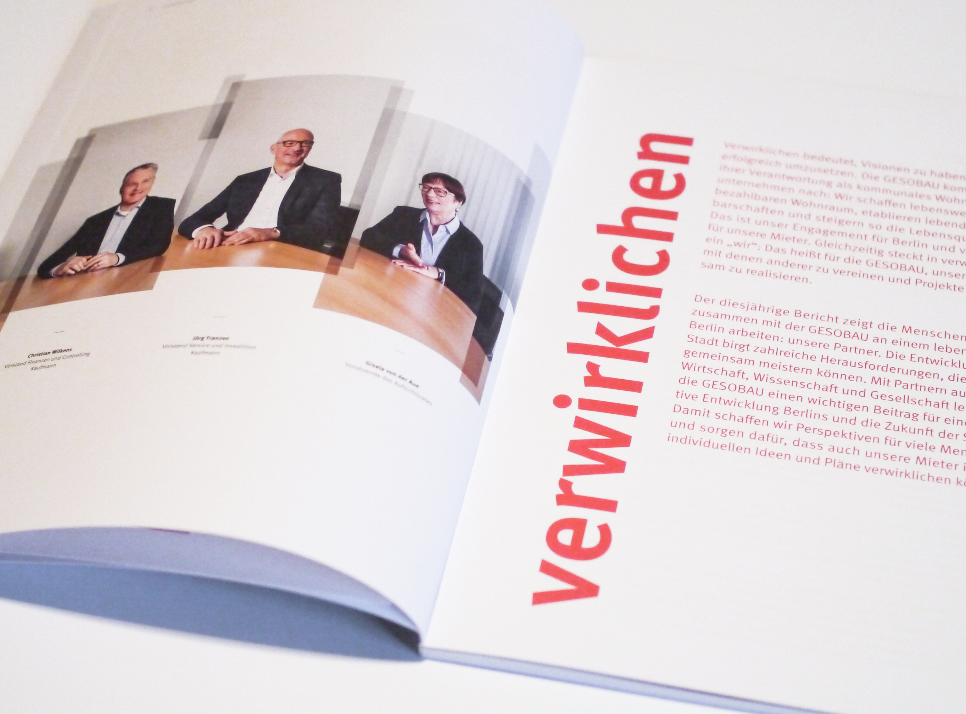 Verwirklichen – unter diesem Motto präsentiert das Berliner Wohnungsunternehmen GESOBAU AG seinen Geschäftsbericht 2017 und zeigt die Perspektive der Partner, die gemeinsam mit der GESOBAU an einem lebenswerten Berlin arbeiten. Vier Storys im Imageteil veranschaulichen dabei das gemeinsame Engagement für die Stadt und die GESOBAU-Mieter.