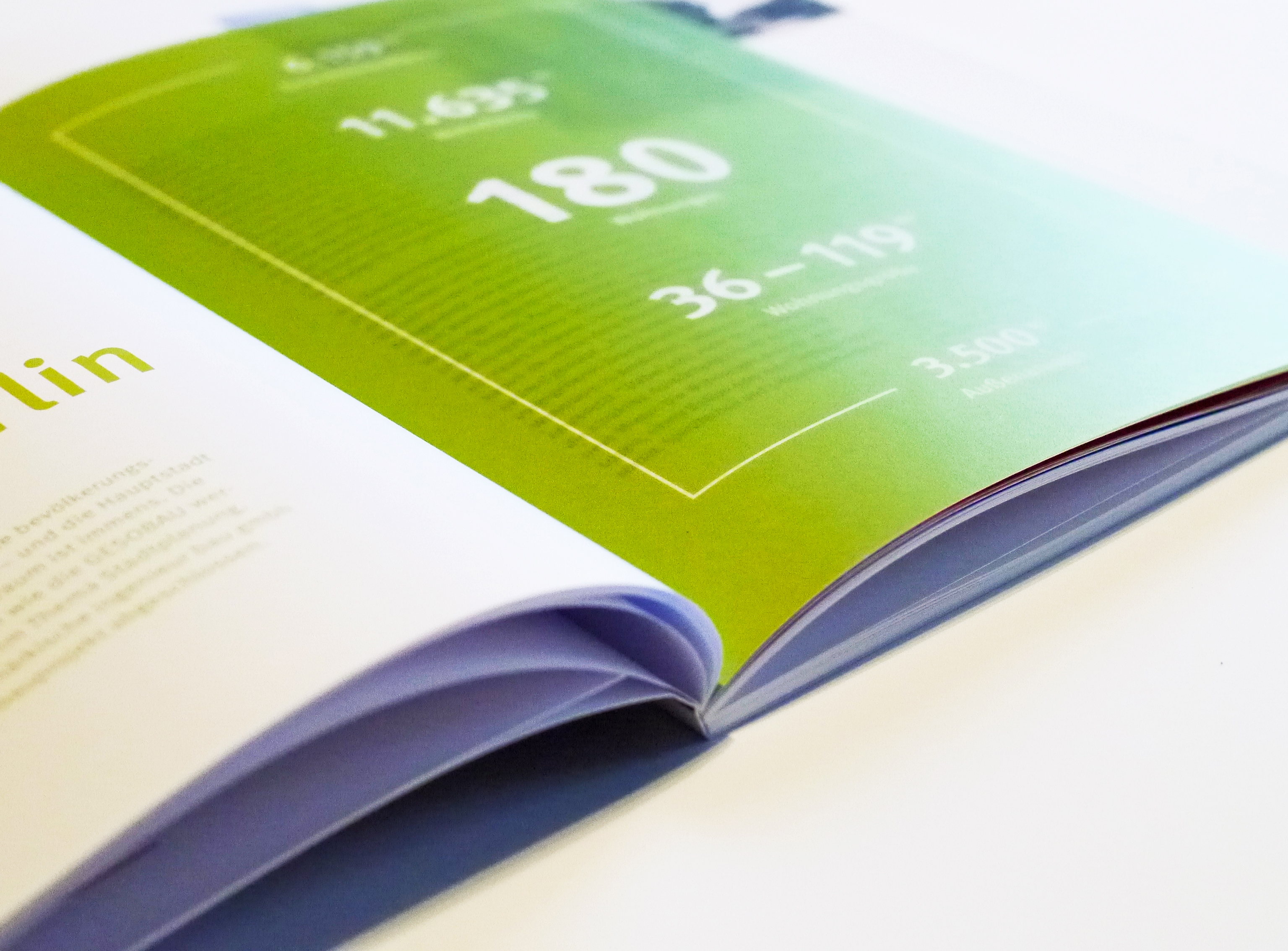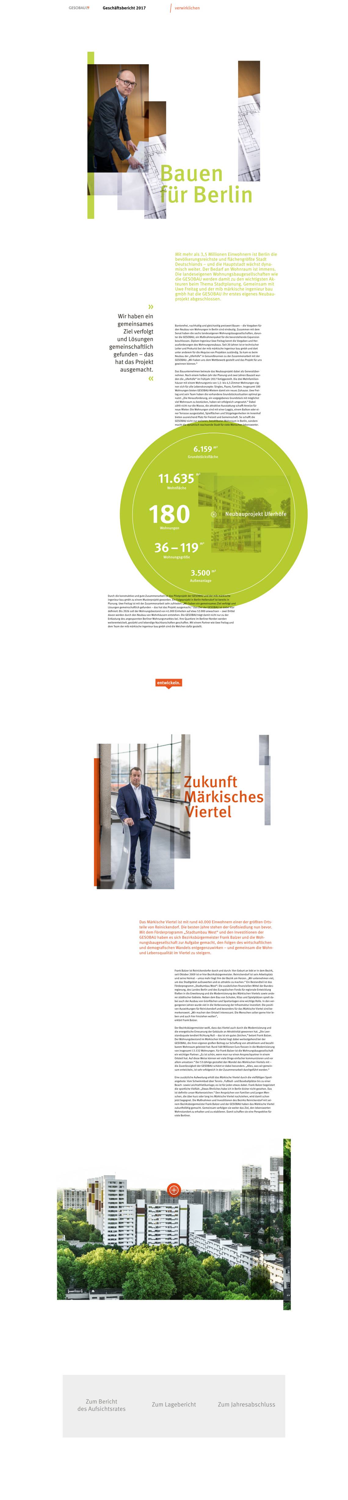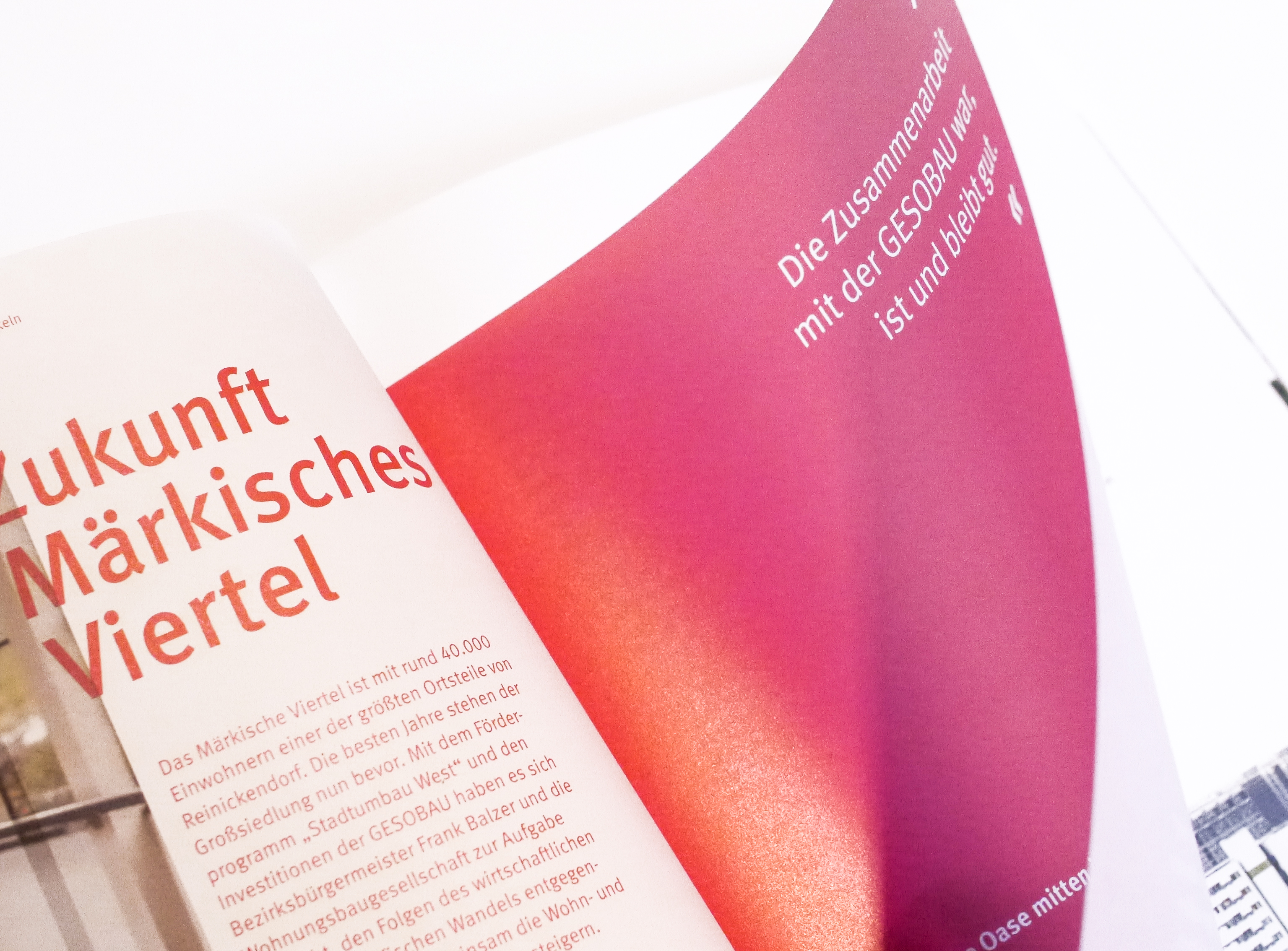 Das Metathema „Perspektiven“, das im Geschäftsbericht 2016 durch die Perspektive der GESOBAU-Mieter eingeführt wurde, wird nicht nur inhaltlich, sondern auch durch die Gestaltung transportiert: Während im Printbericht bedruckte Transparentseiten eine zweite Inhaltsebene zugänglich machen, legen sich im digitalen Geschäftsbericht per Mausklick farbige transparente Flächen über die erste Inhaltsebene und geben eine zweite Perspektive sowie zusätzliche Informationen frei.