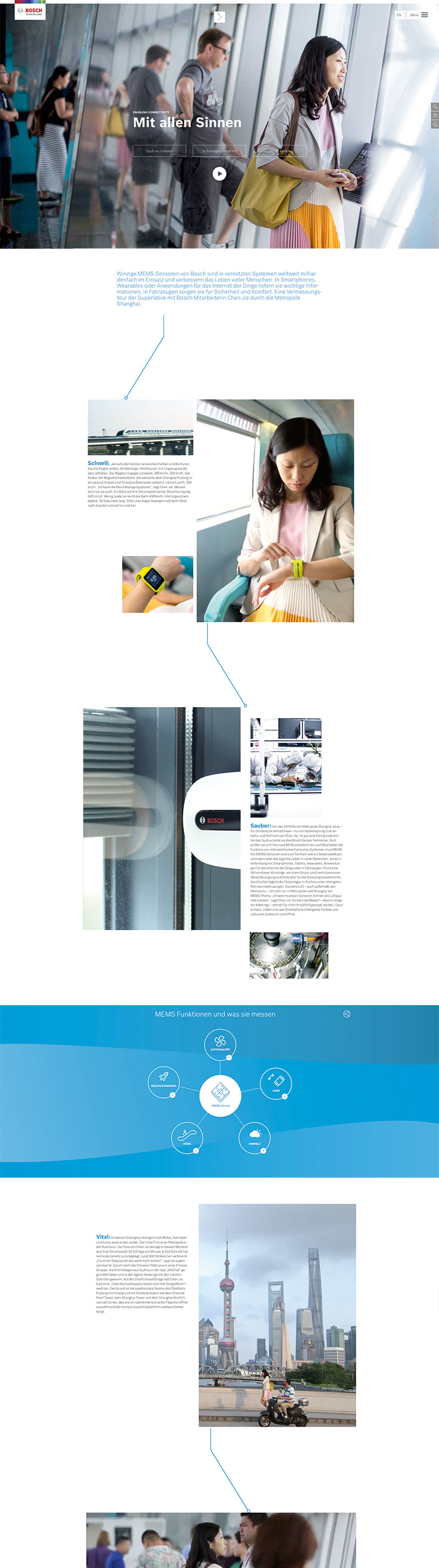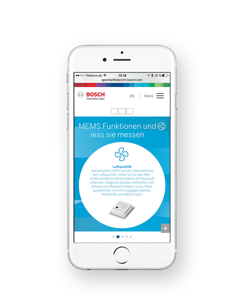Der Geschäftsbericht 2015 der Robert Bosch GmbH steht ganz im Zeichen des Leitthemas „Simply.Connected.“ und zeigt in einem umfangreichen, interaktiven Online-Magazin, wie Bosch schon heute das „Internet der Dinge“ maßgeblich mitgestaltet. Auch deshalb ist der Ansatz in diesem Jahr „digital first“. Vier Hauptstories zu den Themenbereichen Connectivity, Mobility, Industry und Home sowie sieben weitere Geschichten aus unterschiedlichen Unternehmensbereichen nehmen den User mit auf eine Reise durch die vernetzte Welt von Bosch: mit Videos, interaktiven 360-Grad-Ansichten und spielerischen Elementen. Große Bilder, kleine Textportionen, animierte Icons und Illustrationen machen das Scrollytelling zum Erlebnis. Die Online-Version des Geschäftsberichts setzt in der technischen und gestalterischen Umsetzung Maßstäbe.