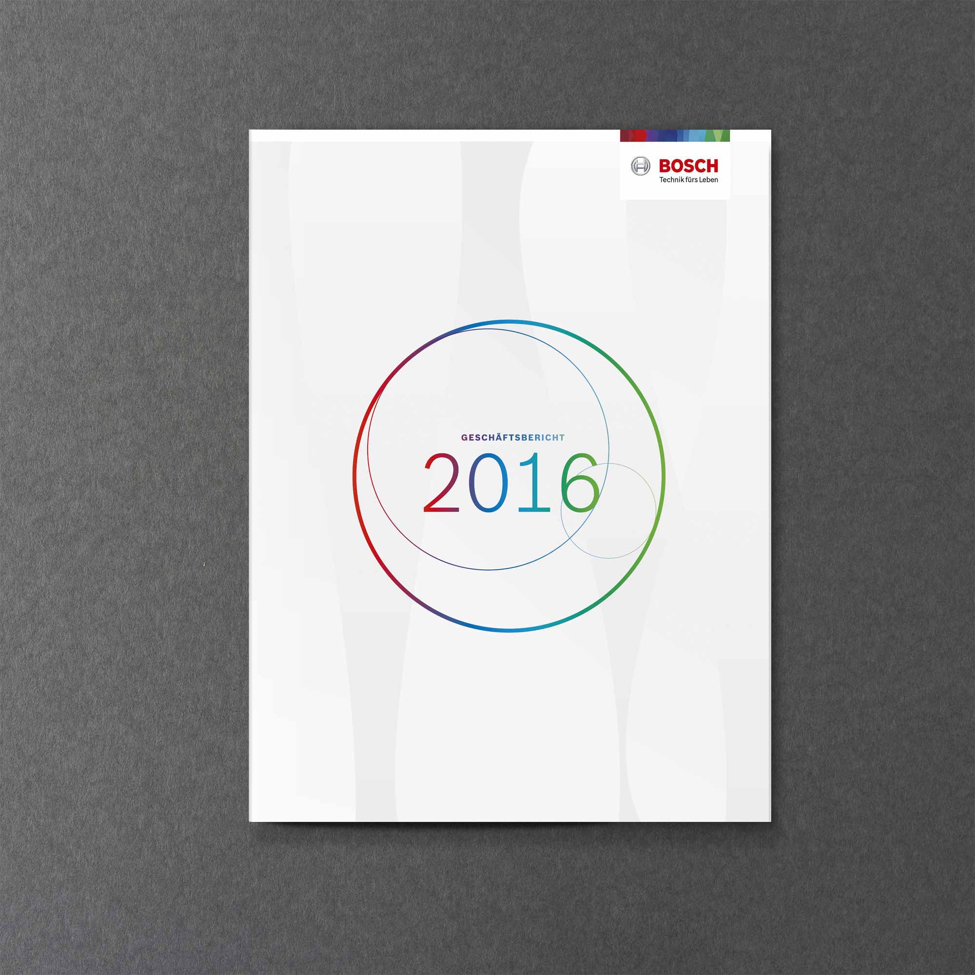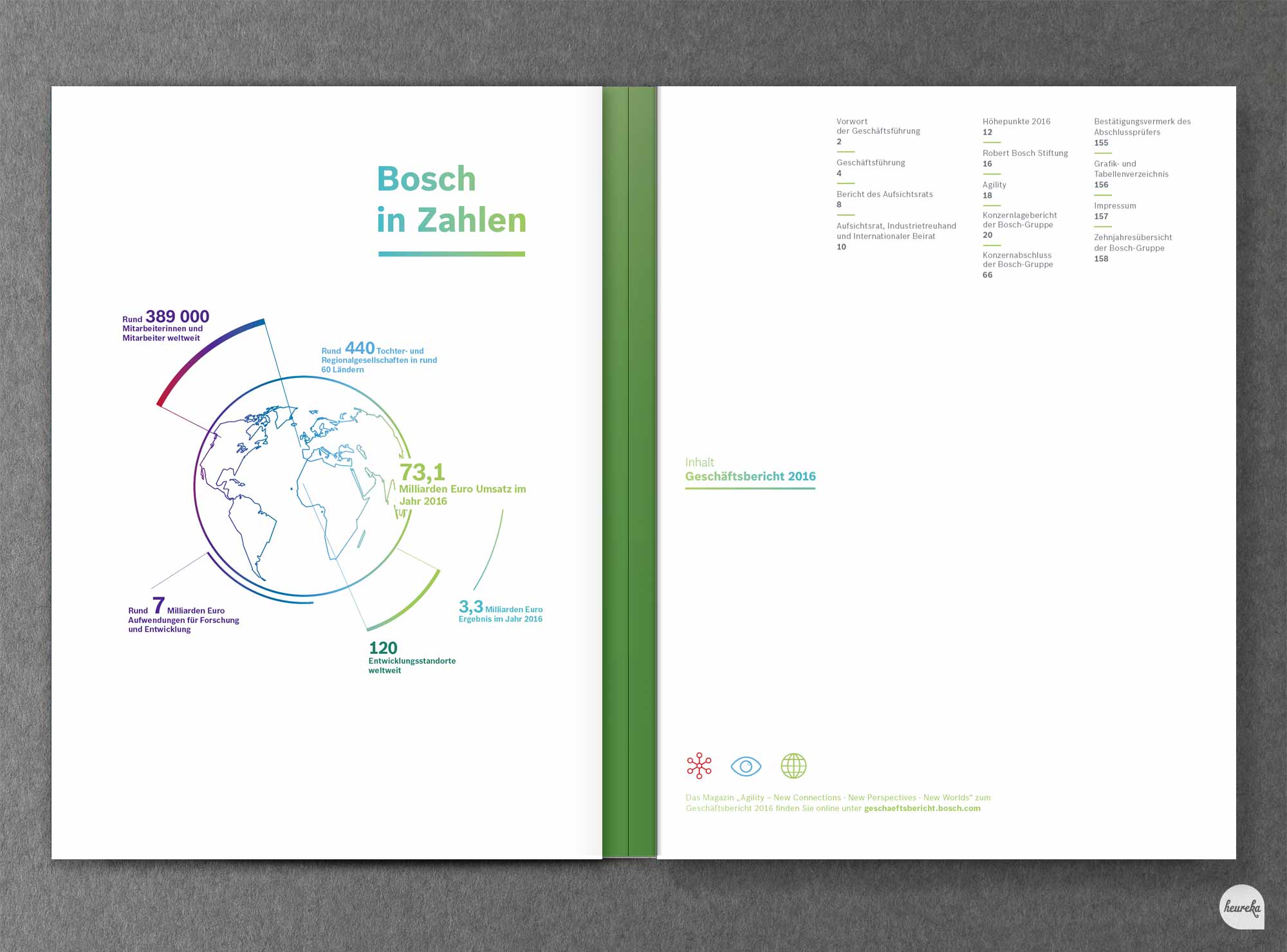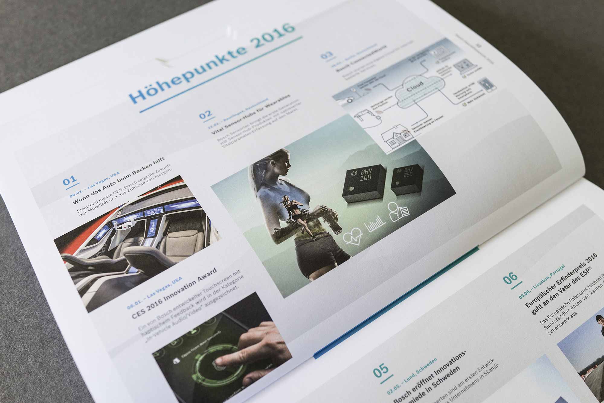 Der 2016er Geschäftsbericht der Bosch-Gruppe steht ganz im Zeichen des Themas „Agility“. Die dem Thema zugrunde liegende Beweglichkeit wird im Print-Bericht gezielt aufgenommen: So wird bei den „Höhepunkten 2016“ das durchgängige Hochformat durchbrochen, so dass der Leser die Publikation intuitiv ins Querformat dreht, um die Einzelartikel zu lesen. Das offene und helle Layout sprengt den starren Satzspiegel und trägt zu einem „grenzenlosen“ Lesen bei.