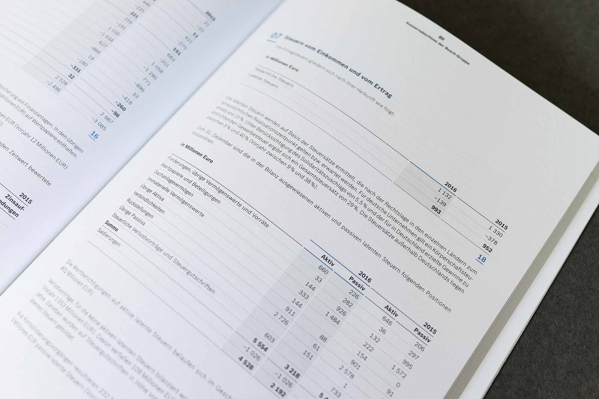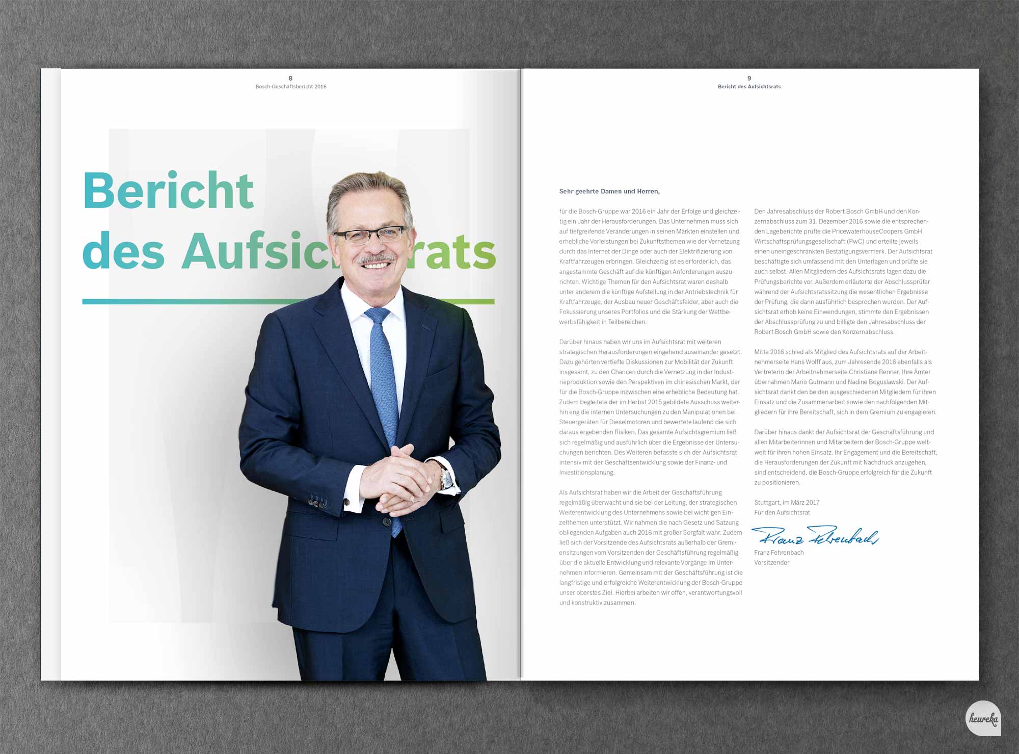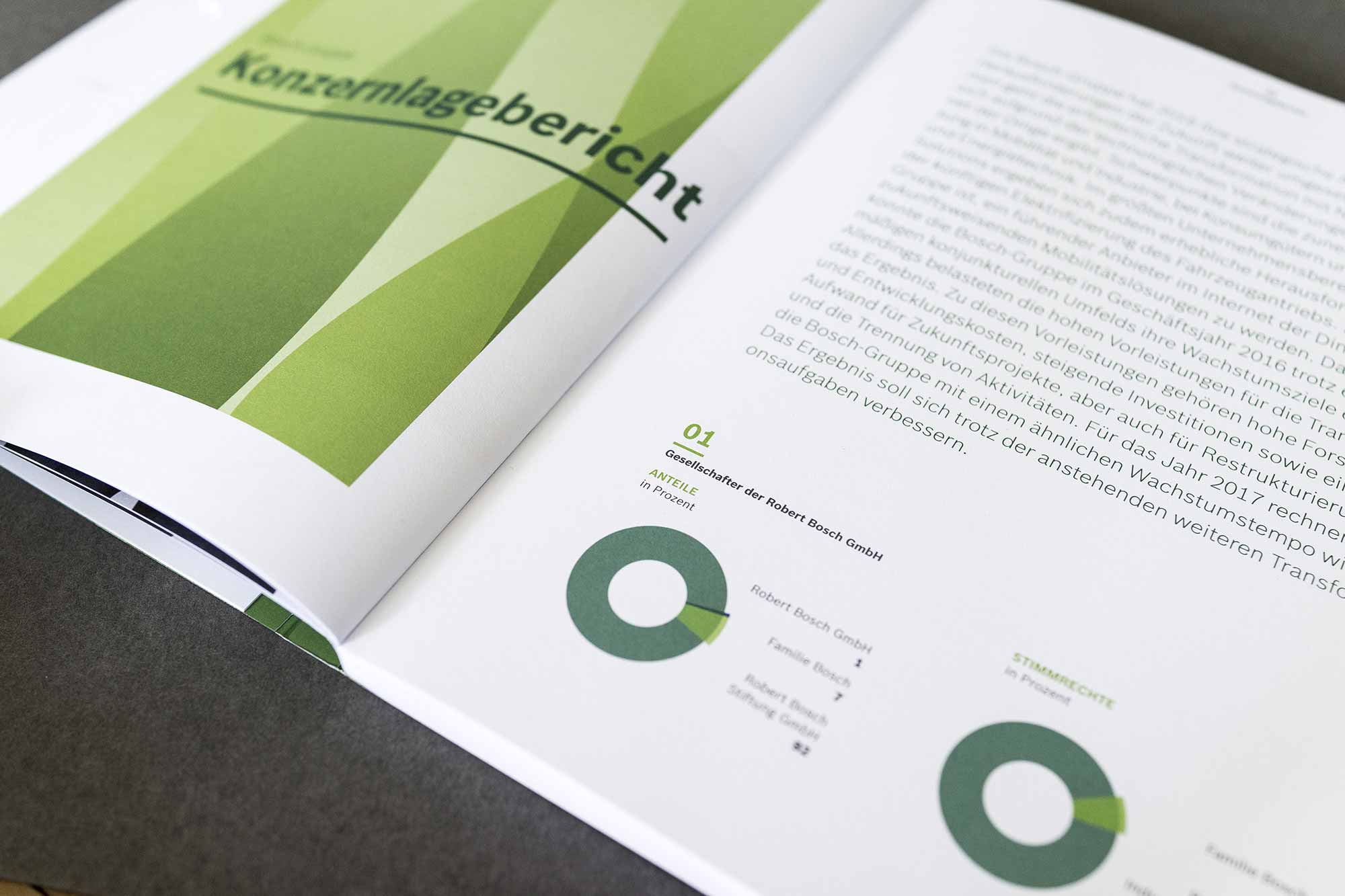 Der 2016er Geschäftsbericht der Bosch-Gruppe steht ganz im Zeichen des Themas „Agility“. Die dem Thema zugrunde liegende Beweglichkeit wird im Print-Bericht gezielt aufgenommen: So wird bei den „Höhepunkten 2016“ das durchgängige Hochformat durchbrochen, so dass der Leser die Publikation intuitiv ins Querformat dreht, um die Einzelartikel zu lesen. Das offene und helle Layout sprengt den starren Satzspiegel und trägt zu einem „grenzenlosen“ Lesen bei.