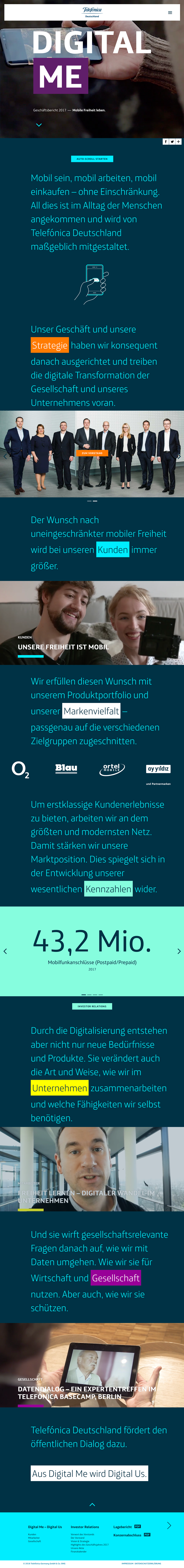 Mobile Freiheit ist ein Grundbedürfnis und damit das Ziel jeder Telefónica-Marke. Als Deutschlands größter Mobilfunkanbieter nach Kunden arbeitet Telefónica Deutschland kontinuierlich daran, dass mobile Datennutzung grenzenlos, unbeschwert und selbstverständlich wird. Das Online-Magazin zum Geschäftsbericht 2017 macht in den drei Kapiteln Kunden, Mitarbeiter und Gesellschaft die mobile Freiheit lebendig. Alle Mitglieder des neuen Vorstands werden dabei mit unterschiedlichen Formaten in den drei Kapiteln eingeführt und sind so Teil des Magazins. Das Magazin spiegelt den Markt, die Kundenbedürfnisse und ihre Vielfalt und bildet so den Rahmen zum Zahlenwerk. Die Produkte spielen in den Storys eine untergeordnete Rolle, das Magazin will keine Produktshow sein, sondern blickt – digital, mobil, emotional – auf die Welt, in der wir leben.