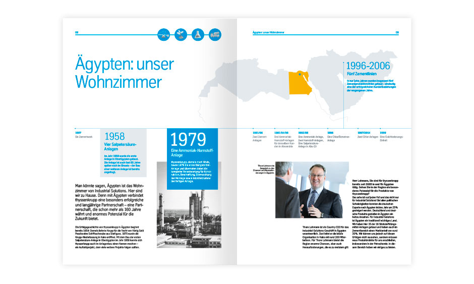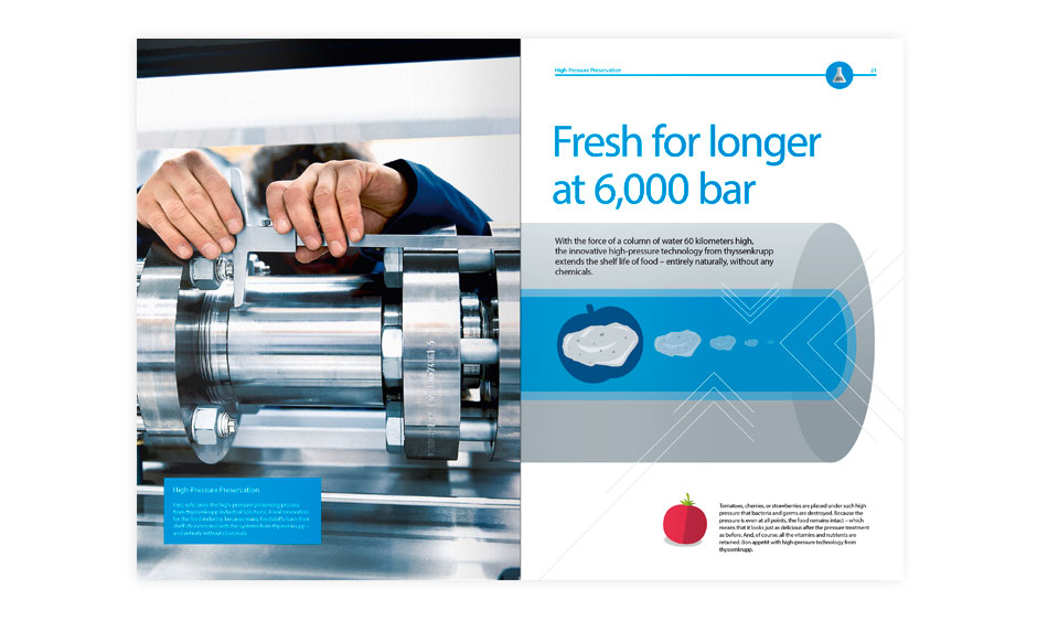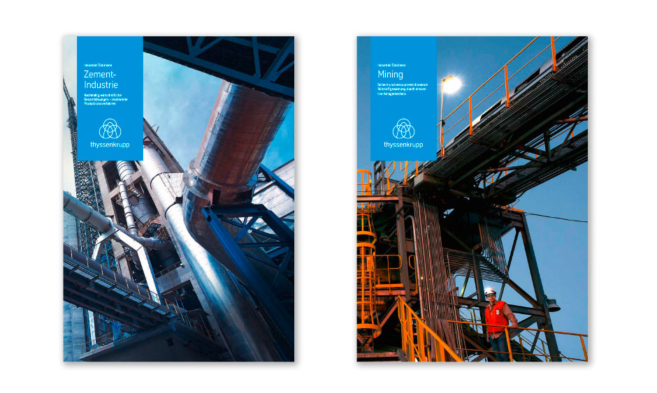 Im Zuge des neuen Markenauftritts des thyssenkrupp Konzerns und der damit verbundenen Corporate-Design-Umstellung war es Aufgabe der heureka, das Broschüren- und Anzeigenkonzept der Business Area (BA) „Industrial Solutions“ grafisch, strukturell und inhaltlich zu überarbeiten.