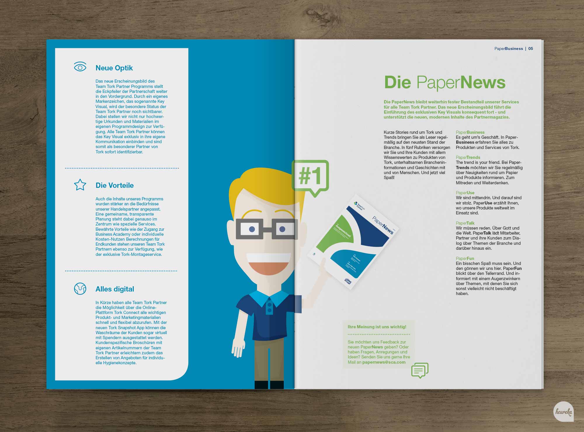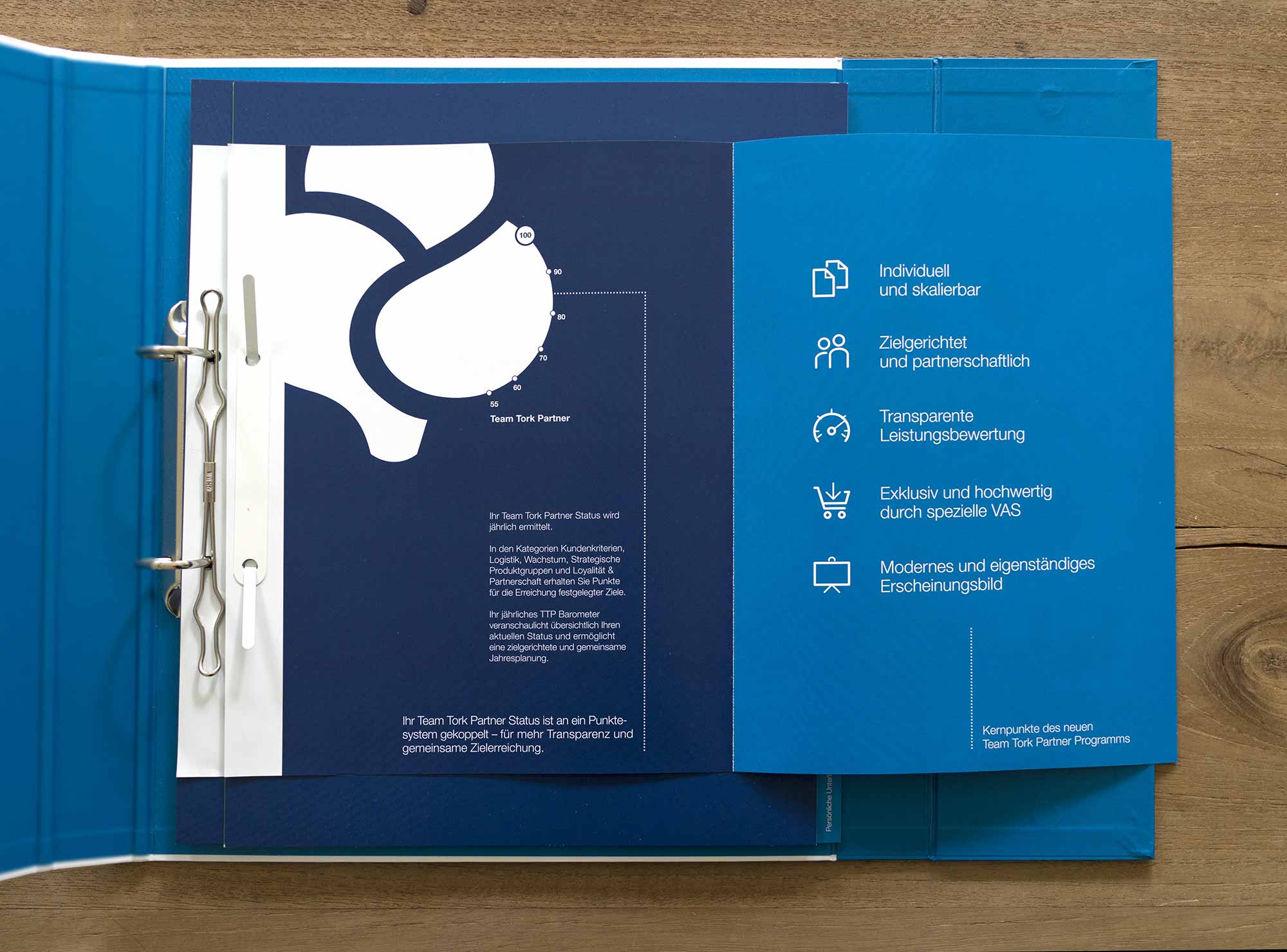 Gemeinsam mit Tork, Marktführer im Bereich Hygienepapierprodukte, entwickeln wir seit 2014 ein Vertriebskonzept zur Bindung und Wertschätzung der Top-Handelspartner. Im Rahmen einer großen Auftakt-Konferenz wurde das TeamTorkPartner-Programm erstmalig Ende 2016 vorgestellt. Auch das Magazin PaperNews erhielt einen kompletten Refresh – inhaltlich und grafisch. Darüber hinaus konzipieren und erarbeiten wir für Tork weiterführende Vertriebsmaterialien wie Broschüren, animierte Videos und Präsentationen.